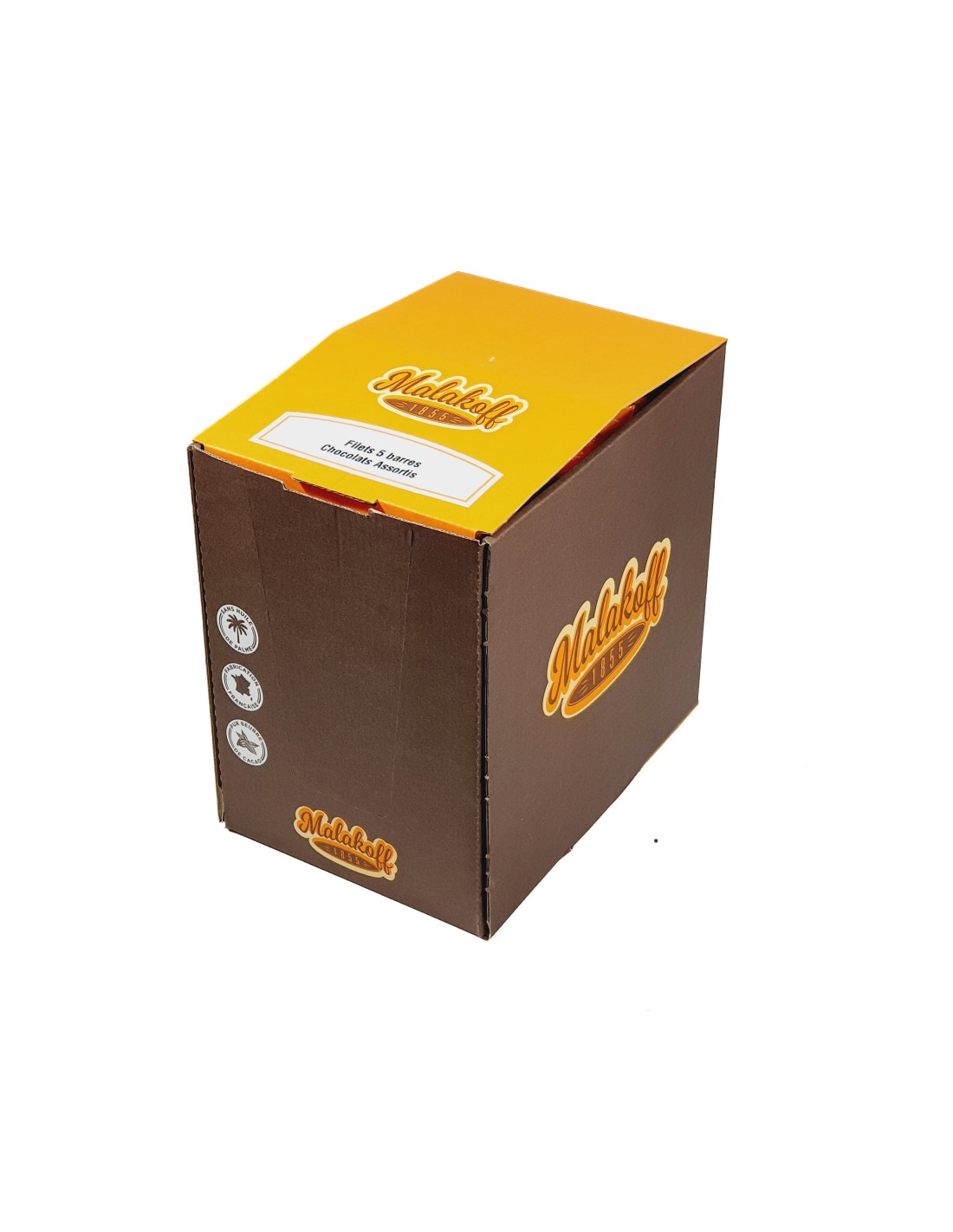 Mettez en avant le présentoir MALAKOFF qui offre 20 filets de 5 barres chocolatées, chacune représentant une des 5 références variées. Fabriquées en France avec du pur beurre de cacao, ces barres démontrent l'expertise artisanale de notre chocolaterie. Idéal pour attirer une clientèle diversifiée, ce présentoir varié séduira par sa qualité et son choix.