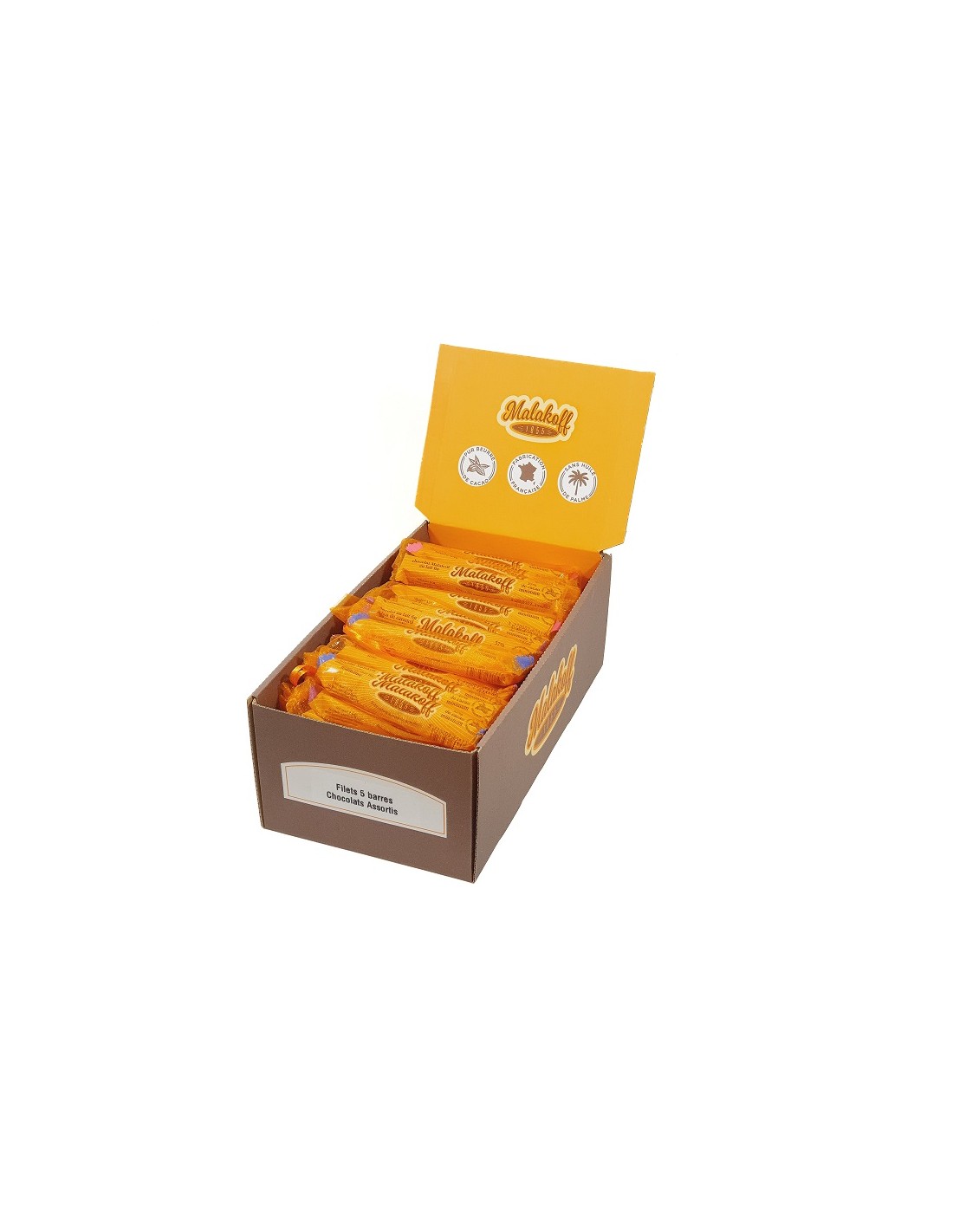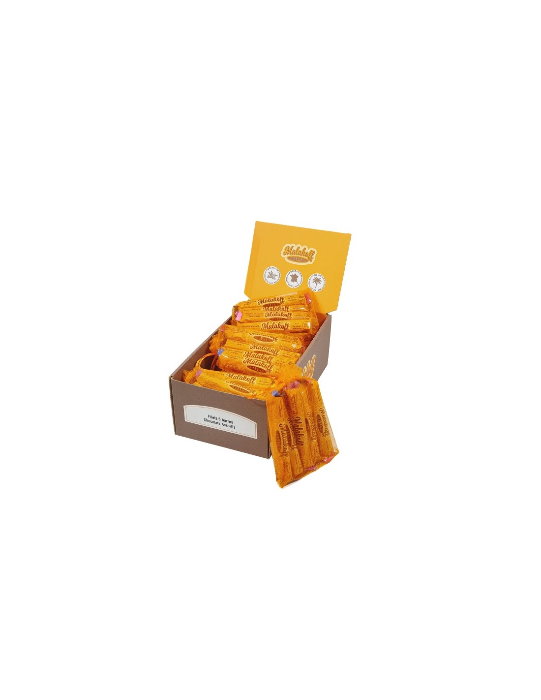 Succombez au charme de nos assortiments de barres chocolatées, présentées en 12 filets de 5 barres chacun. Confectionnées avec passion dans notre atelier français, ces créations allient pur beurre de cacao et recettes variées pour séduire tous les palais. Une sélection idéale pour diversifier l'offre de votre boutique et ravir vos clients à la recherche de saveurs authentiques et raffinées.