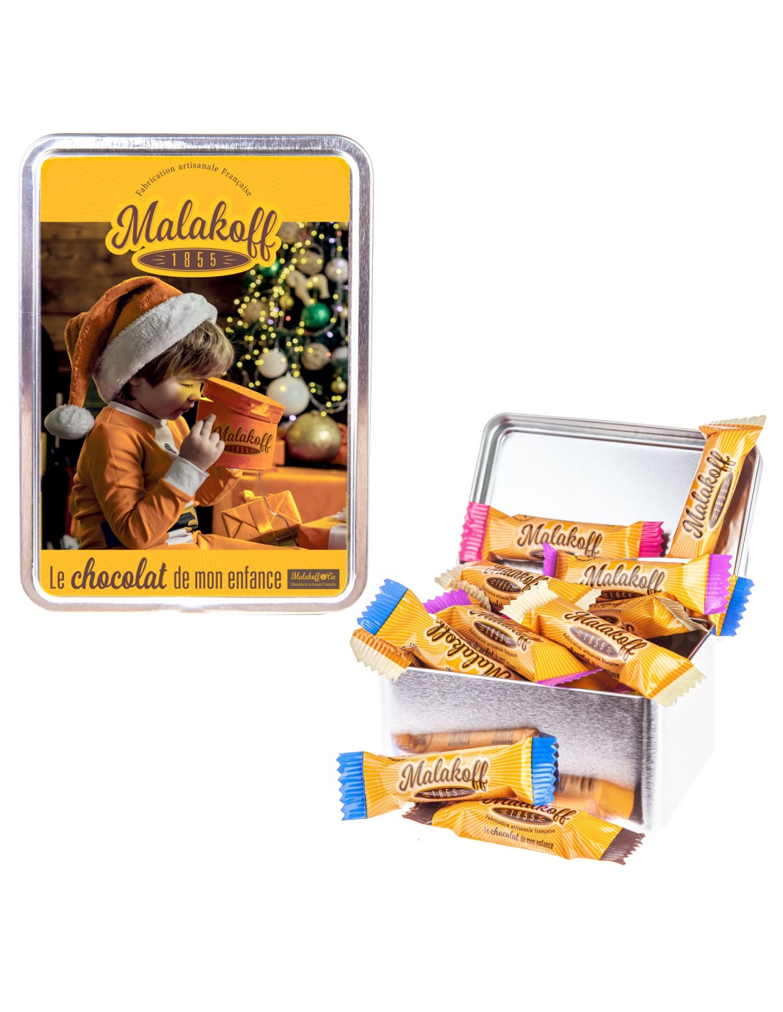 Offrez un enchantement festif avec notre mini coffret métal MALAKOFF, édition Noël MALAKOFF1855, spécialement conçu pour ravir vos clients durant les fêtes. Ce coffret dévoile un assortiment précieux de nos chocolats artisanaux : savoureux chocolat au lait noisettes, délicat lait feuilletine, surprenant lait pétillant, onctueux lait caramel, intense noir noisettes, et exquis blanc noisettes. Idéal pour les revendeurs désireux de proposer une expérience gustative unique et raffinée, chaque pièce est une célébration de notre héritage chocolatier français. Un cadeau parfait pour partager la joie et le goût inégalé des fêtes.