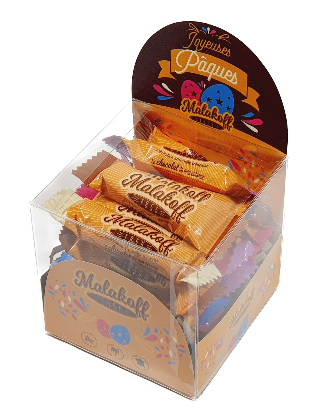 Une jolie boite transparente MALAKOFF1855 visuel Pâques. Assortiment de 15 mini Malakoff1855.