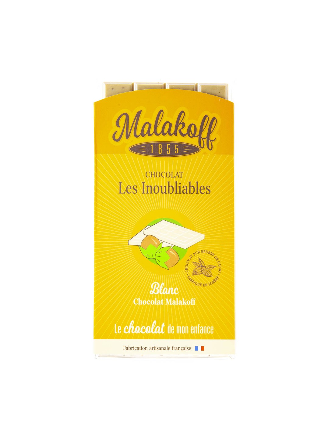 Partagez un moment de douceur avec notre tablette chocolat blanc fabriquée artisanalement en Lozère. Vous découvrirez l'équilibre du chocolat blanc Malakoff qui, à l'origine, est un mélange de lait et de sucre. Notre chocolat blanc est conçu dans les traditions du vrai chocolat ivoire avec du chocolat pur beurre de cacao. Pas trop sucré, il ravira tous les amateurs de chocolat blanc.