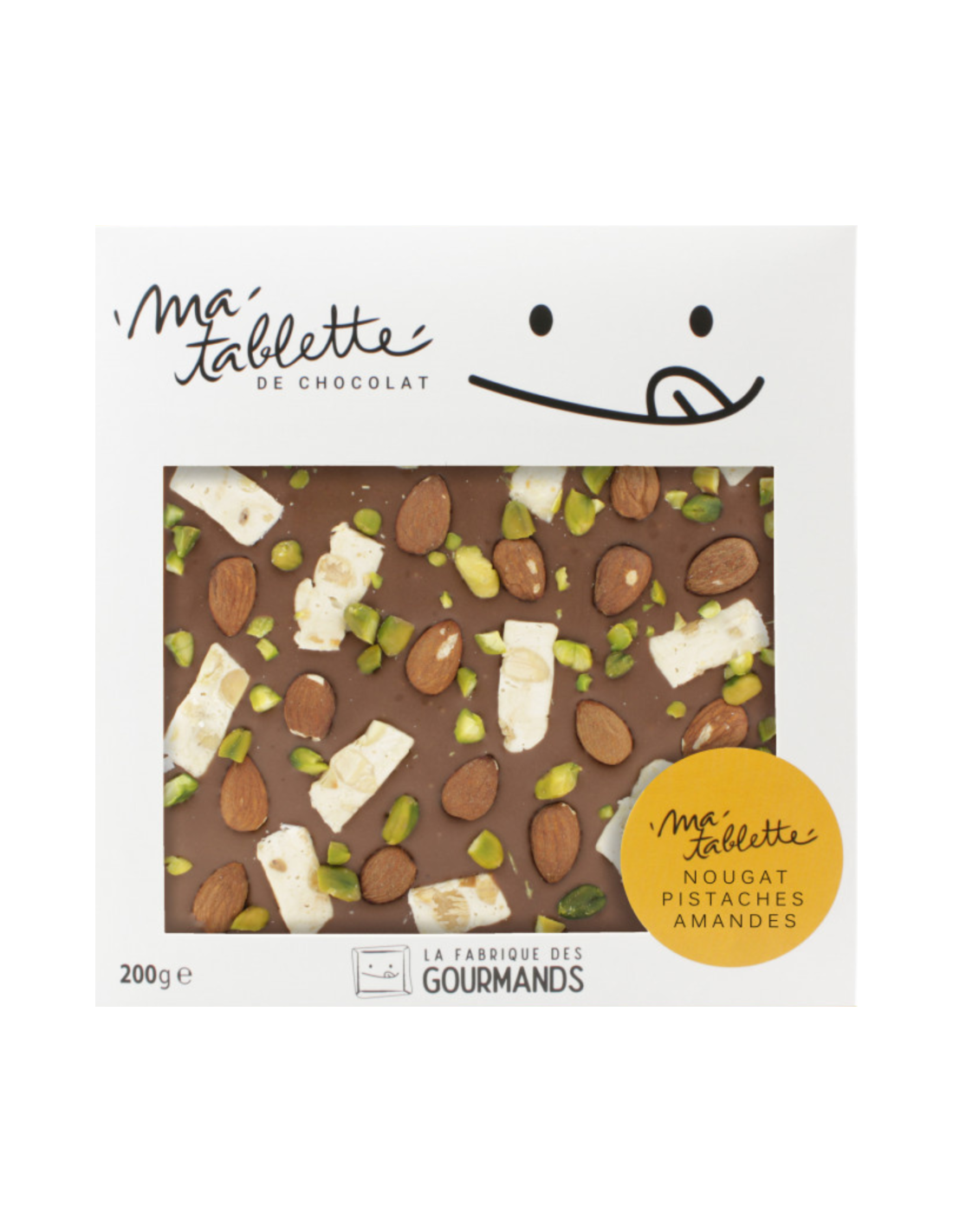 Chocolat au lait (sucre, LAIT entier en poudre, beurre de cacao, pâte de cacao, émulsifiant: lécithine, arôme naturel de vanille), AMANDES 10%, Nougat de Montélimar 7,5% (AMANDES, sucre, sirop de glucose, miel, beurre de cacao, pain azyme (fécule de pomme de terre, eau, huile de tournesol), blanc d'ŒUF, arôme naturel de vanille), PISTACHES 6%.