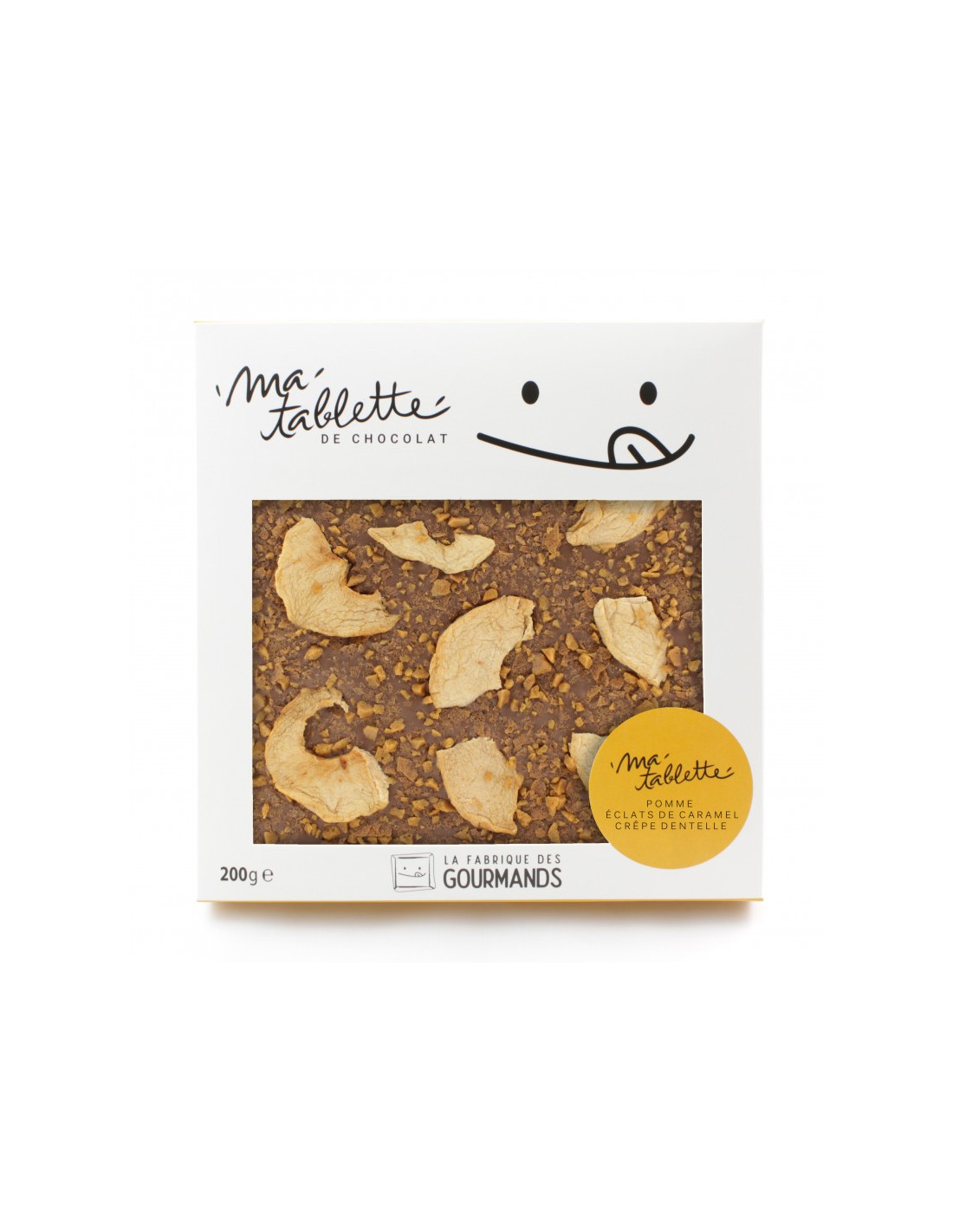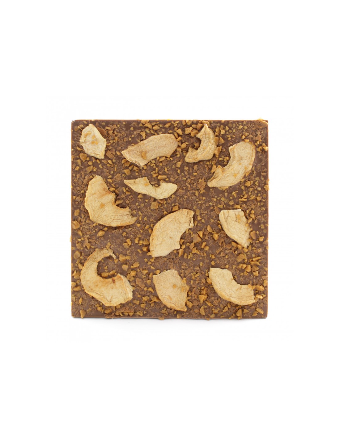 Chocolat au lait (sucre, LAIT entier en poudre 29.5%, beurre de cacao, pâte de cacao, émulsifiant: lécithine de SOJA, arôme naturel de vanille), Pommes séchées 7.5%, Éclats de caramel au beurre salé 4% (Sucre, Beurre frais (LAIT), Crème (LAIT), fleur de sel de Guérande), crêpes dentelles 3% (farine de BLÉ 41%, sucre, Beurre concentré (LAIT) 8%, Sucre du LAIT 1.5%, protéines du LAIT 1.5%, Extrait de malt (ORGE) <1%, Poudre à lever).