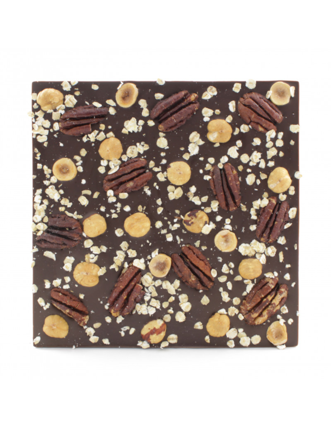 Chocolat noir 70% de cacao (pâte de cacao, sucre, beurre de cacao, émulsifiant: lécithine, arôme naturel de vanille), NOISETTES 10%, NOIX de pécan 10%, flocons d'AVOINE, fleur de sel de Guérande