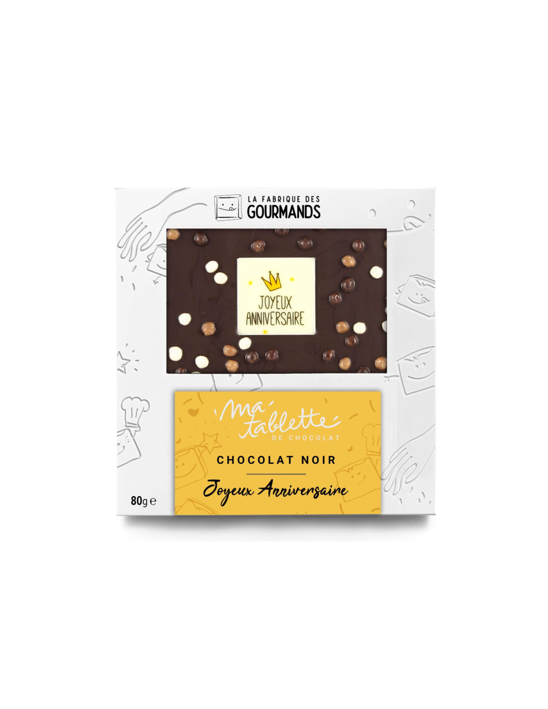 Découvrez la tablette de chocolat noir "Anniversaire" 80g par La Fabrique des Gourmands. Un chocolat artisanal français, pur beurre de cacao, idéal pour vos clients. Offrez une expérience gustative exceptionnelle avec ce produit raffiné et festif. Ajoutez une touche d'élégance à votre offre et séduisez vos clients avec ce délice authentique et irrésistible.